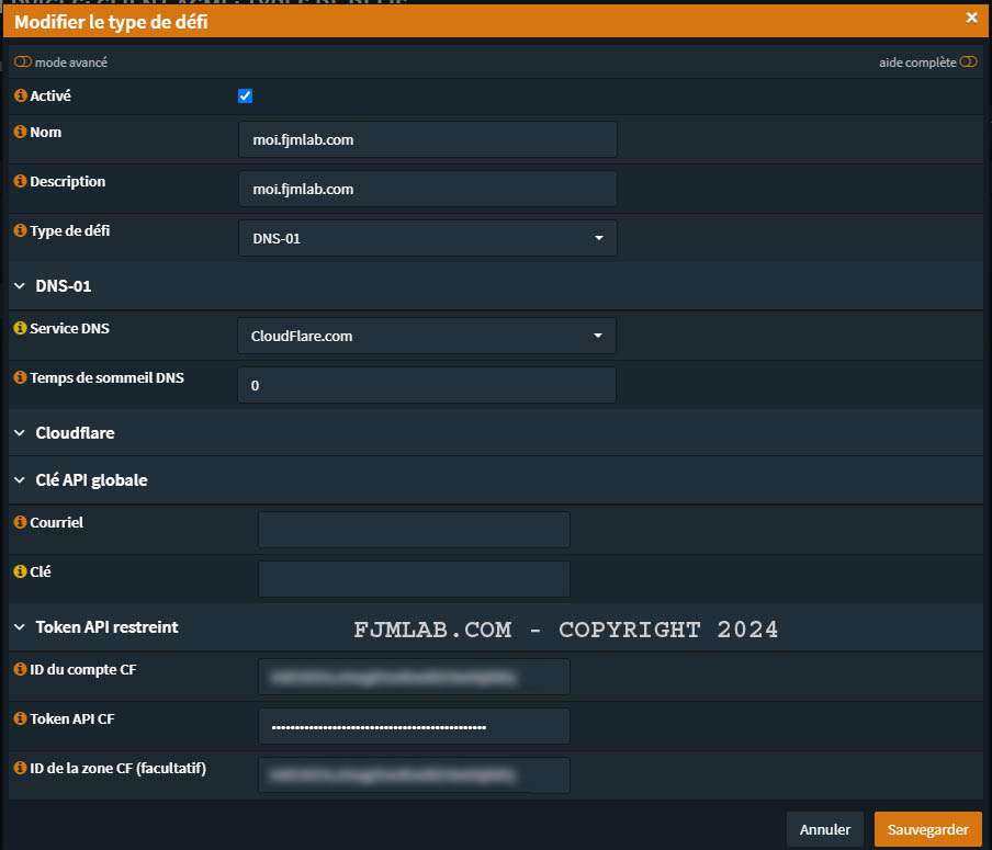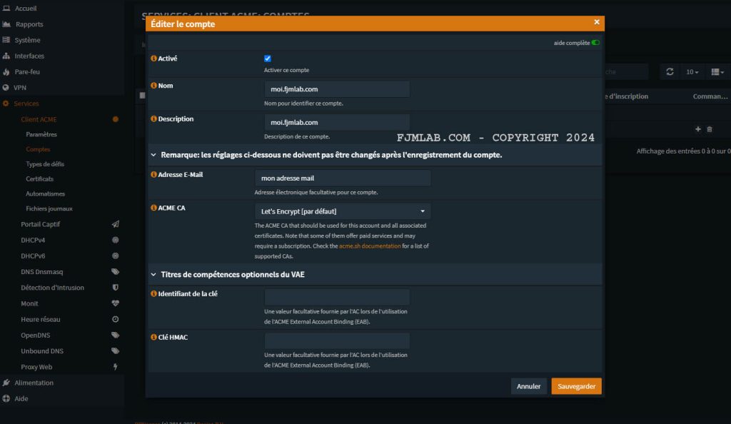 Mettez ce que vous voulez pour le nom et la description du compte. Le plus important est d’avoir une adresse mail valide et de bien choisir Let’s Encrypt comme ACME Certificat Authority qui est en principe présélectionné par défaut.