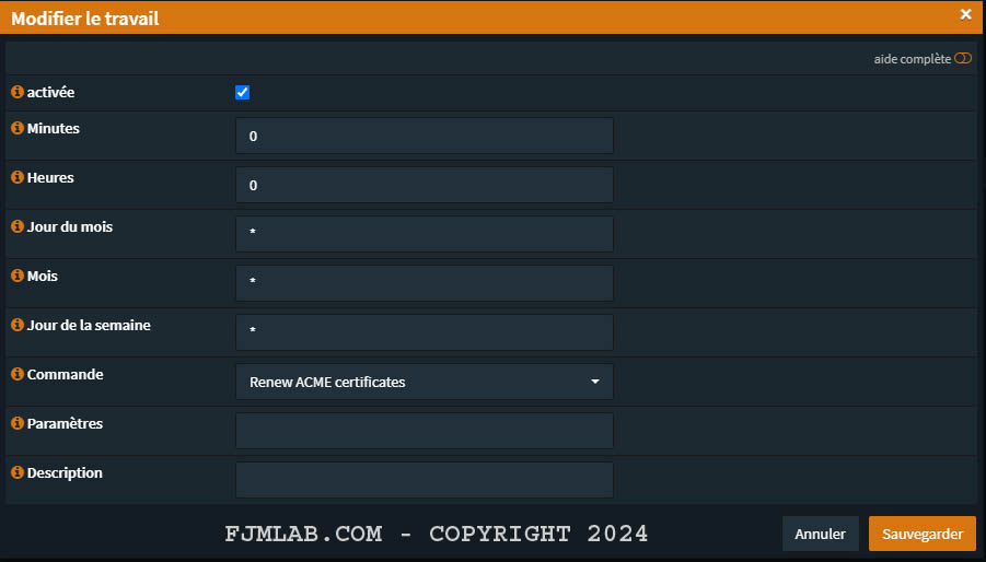 Vous pouvez tout laisser par défaut. Sélectionnez juste la commande « Renew ACME Certificates » et ajouter éventuellement votre description :