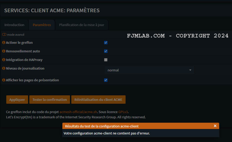 Allez sur Service > Client ACME > Paramètres et cocher la case « Activer le Greffon ».