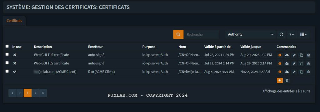 >> Vous devriez retrouver le certificats valide dans Système > Gestion des Certificats > Certificats :