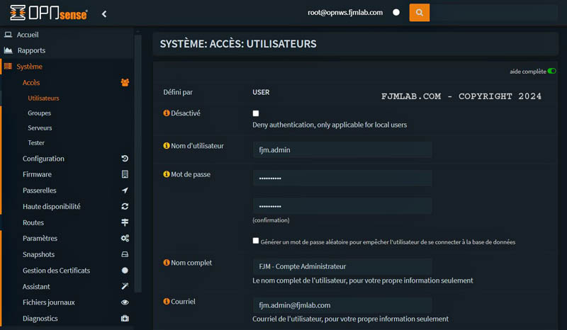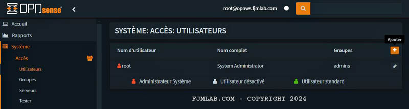 Je vous conseille aussi de désactivé le compte ROOT par défaut pour le remplacer par celui que vous voulez. Vous pouvez ajouter également un deuxième compte sans les droits d’admin, ce qui vous permettra de voir la configuration du firewall sans risque de modification.